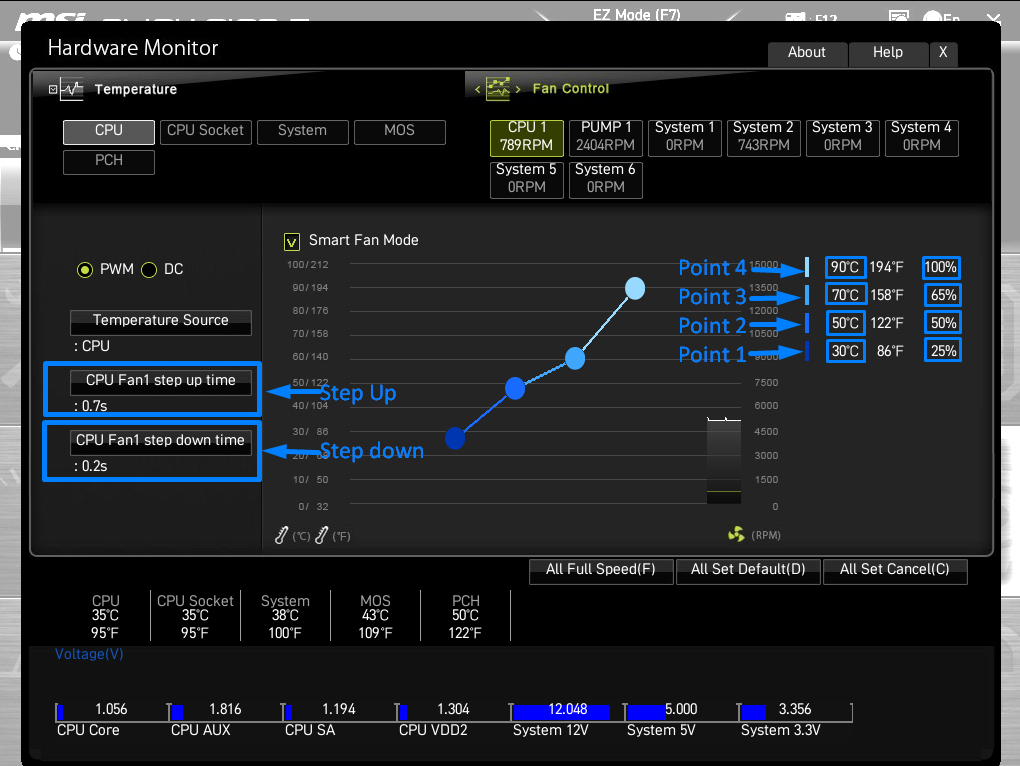 All System Fans Fan Control: Auto/PWM Fan Step Up: 0.7 seconds Fan Step Down: 0.2 seconds Point 1 Temp: 30°C Point 1 %: 25% (Adjust this to 35% if your fans are Phanteks fans or not spinning periodically) Point 2 Temp: 50°C Point 2 %: 30% (Set to 40% if phanteks) Point 3 Temp: 70°C Point 3 %: 40% (Set to 50% if phanteks) Point 4 Temp: 80°C Point 4 %: 50% (Set to 60% if phanteks) Do not change any other settings