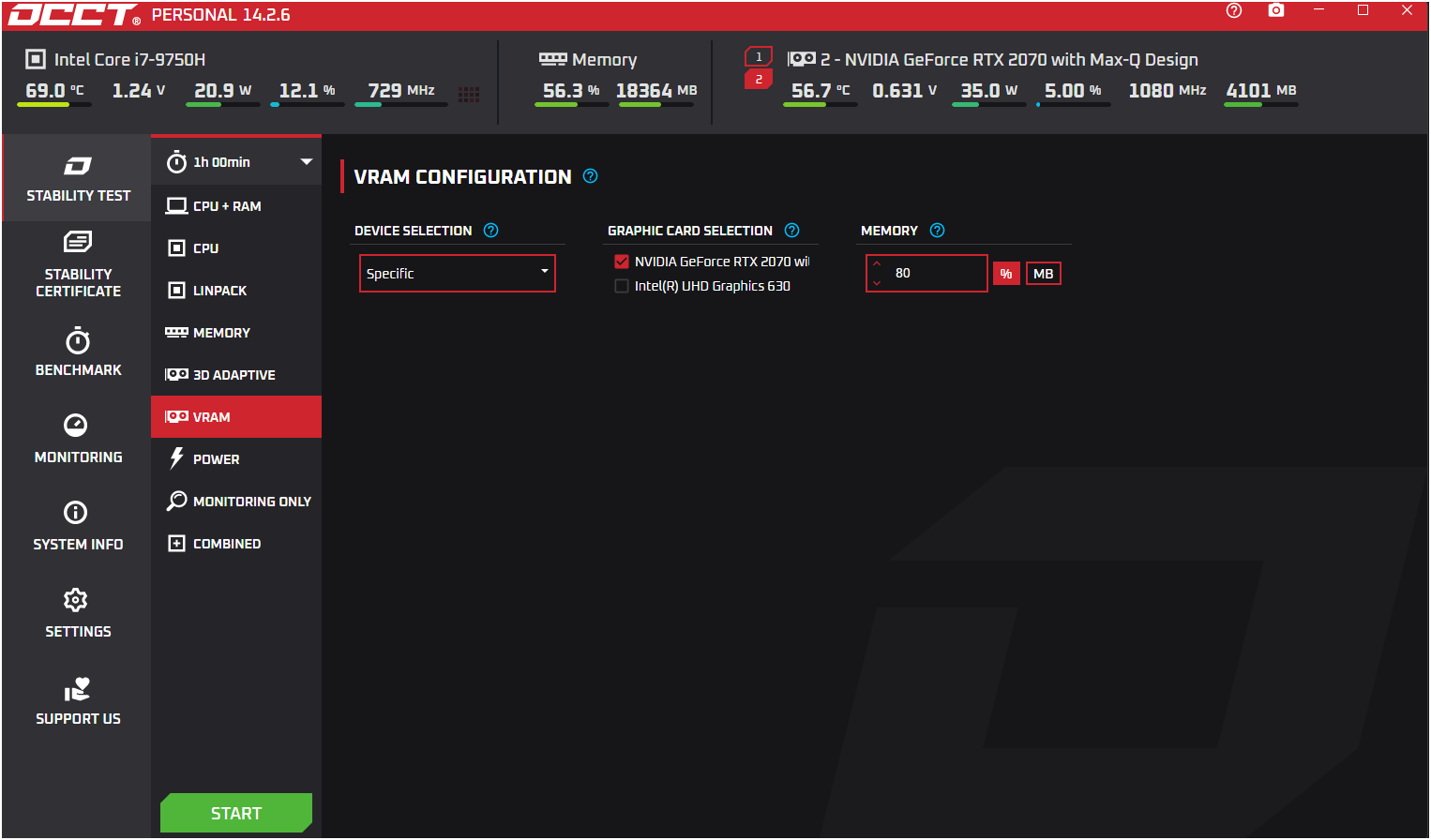 Select VRAM and set the test for 1 Hour
