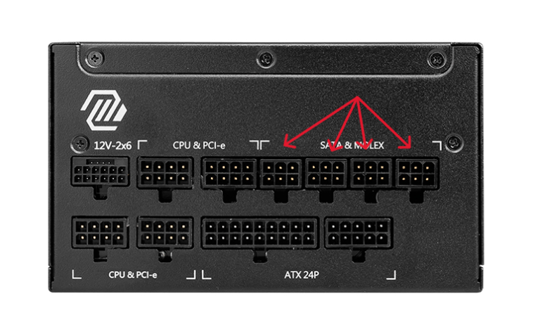 Once you have these drives in their bays, you will plug in the 6-pin connector of the SATA Power Cable into the power supply located on your power supply as shown below. It can be in any of the free slots.
